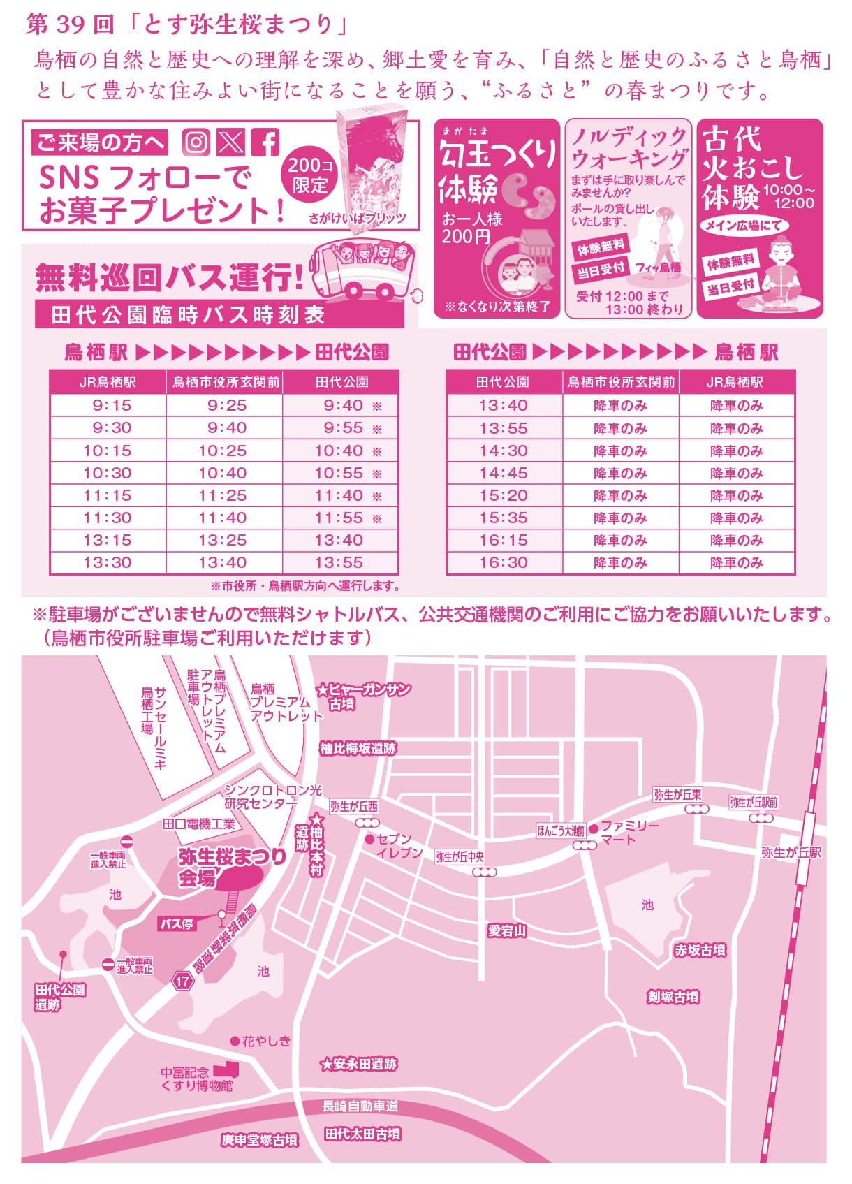 また、遺跡ポイントラリー、火起こしや勾玉(まがたま)作り体験、ノルディックウォーキング体験会、飲食物販やバザーも同時開催します。