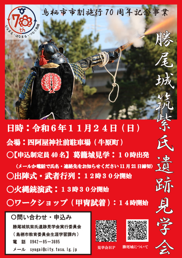 鳥栖市の北西部には、勝尾城を中心とした山城跡が広がっています。今回の見学会では、葛籠城の見学に加え、鳥栖市制70周年を記念して豊後大友宗麟鉄砲隊による火縄銃の演武も予定しています。詳細は見学会ホームページでご確認ください。ぜひご参加ください。