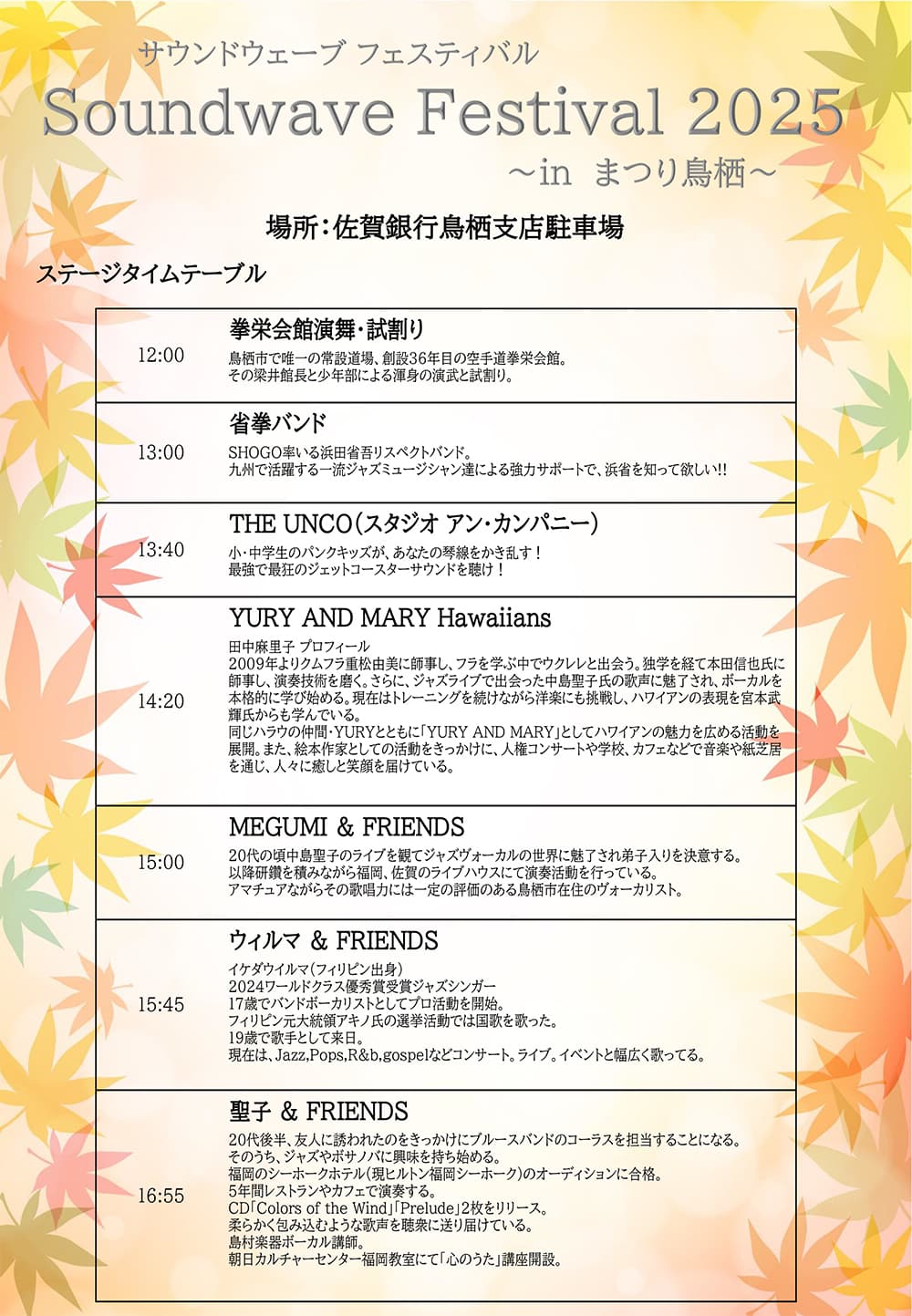 | 後 援 | 鳥栖市、鳥栖商工会議所、鳥栖商工会議所女性会、鳥栖商工会議所青年部、鳥栖青年会議所、鳥栖市商店街連合会、鳥栖本通筋商店街振興組合、鳥栖市文化連盟、鳥栖市区長連合会、鳥栖法人会、鳥栖ロータリークラブ、鳥栖ライオンズクラブ、鳥栖養基ライオンズクラブ、(株)CRCCメディア、鳥栖観光コンベンション協会 |