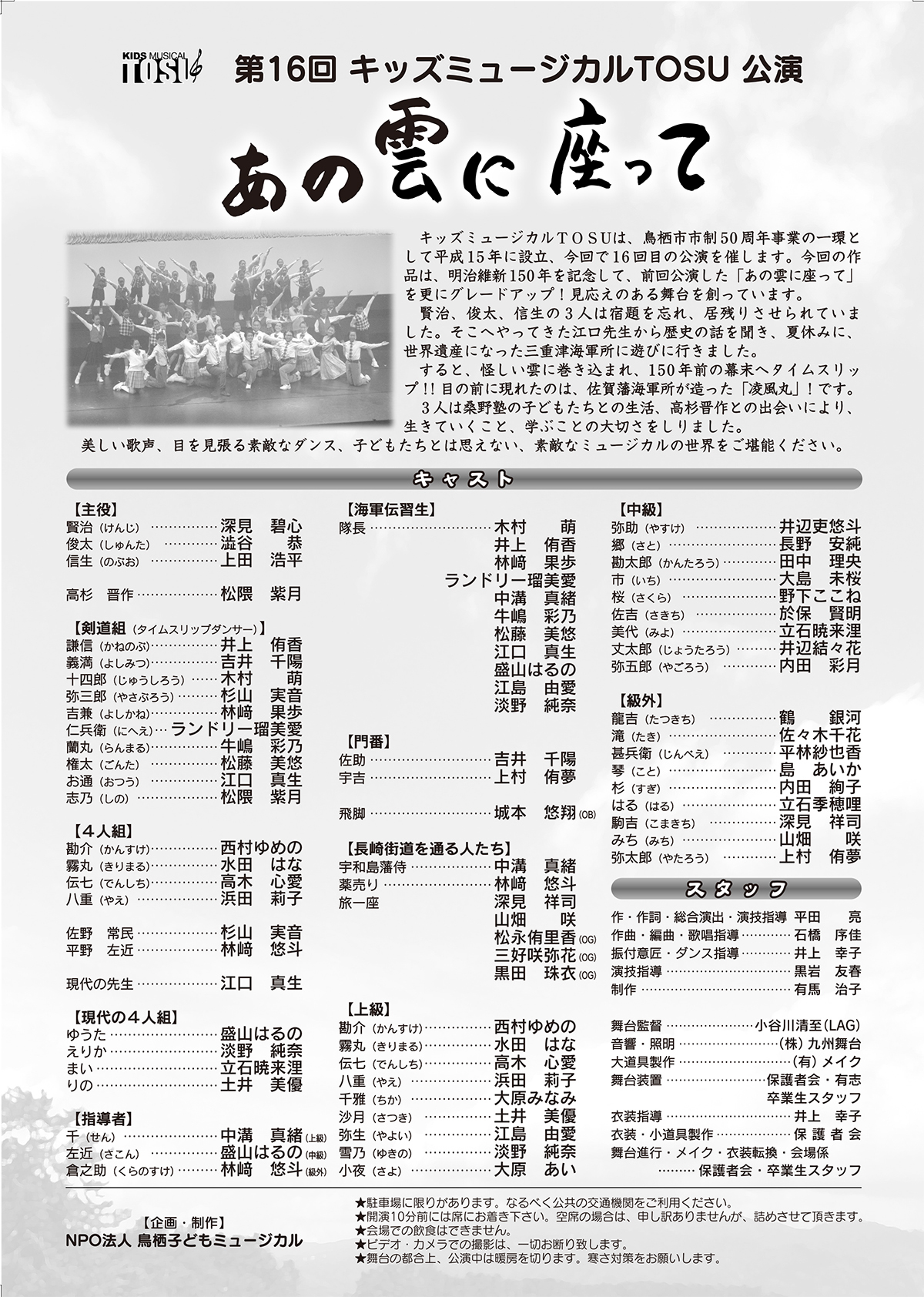 ミュージカルという表現活動を通しての子どもの健全育成と地域からの質の高い文化の発信を目的に鳥栖市及びその周辺地域の小学校3年生から中学生までを対象に参加者を募り、約1年近くの練習を重ね、年1回の舞台公演をしています。また、お祭りやイベントにも参加し、地域に根差し、愛される団体を目指しています。