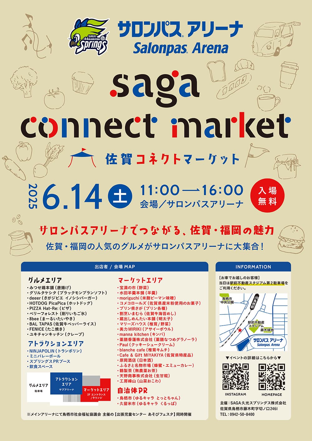 福岡・佐賀のグルメや特産品が楽しめるマーケットイベントがサロンパスアリーナで開催!施設内サブアリーナでは、ミニバレーボールやトランポリンなどのアトラクションもお楽しみいただけます。