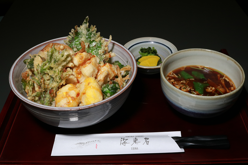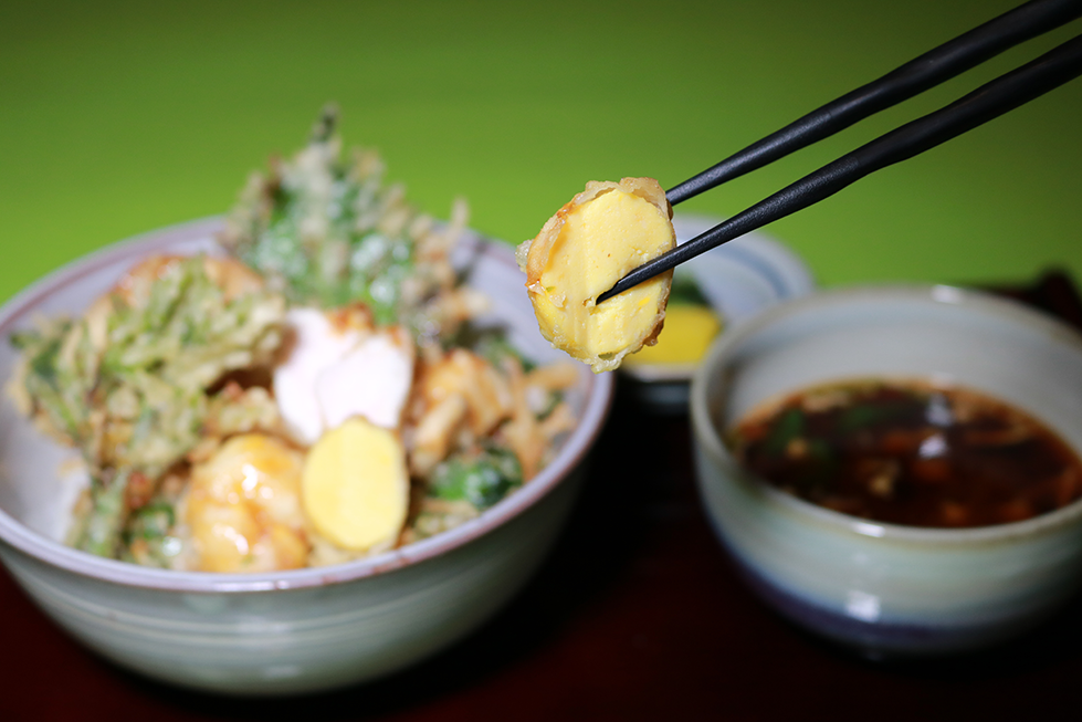 鳥の巣ごもりをイメージしたとりこどん。県内産のご飯の上には、鳥の巣に見立てた野菜の天ぷらを敷きつめる。サクサクの衣に中はジューシーな鶏肉。ゆでた卵を裏ごしし、味付けして卵の形にした卵の天ぷら。春は地元産のウドやタラの芽と、季節ごとに変わる旬の野菜が香りと食感を一層引き立て、タレが絶妙なバランスを生み出してます。赤だし付き。