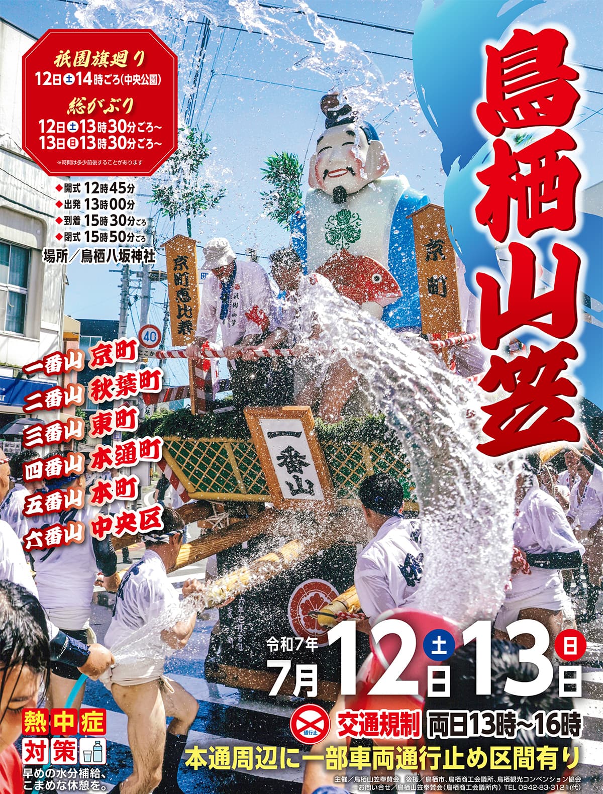 昭和3年(1928年)に始まった勇壮な鳥栖山笠。一番山から六番山までの6基の山車と子供山が市街地を駆け抜け、夏本番を告げます。
