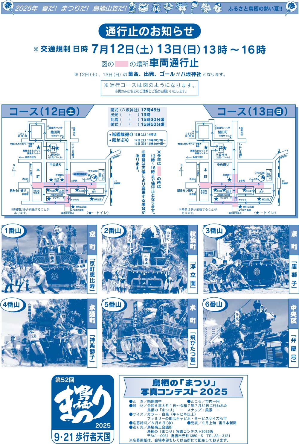 | 内 容 | 祇園旗廻り(中央公園・12(土)のみ14時頃〜)、総がぶり(本通り商店街一帯・12(土)13(日)13時30分頃〜) |
