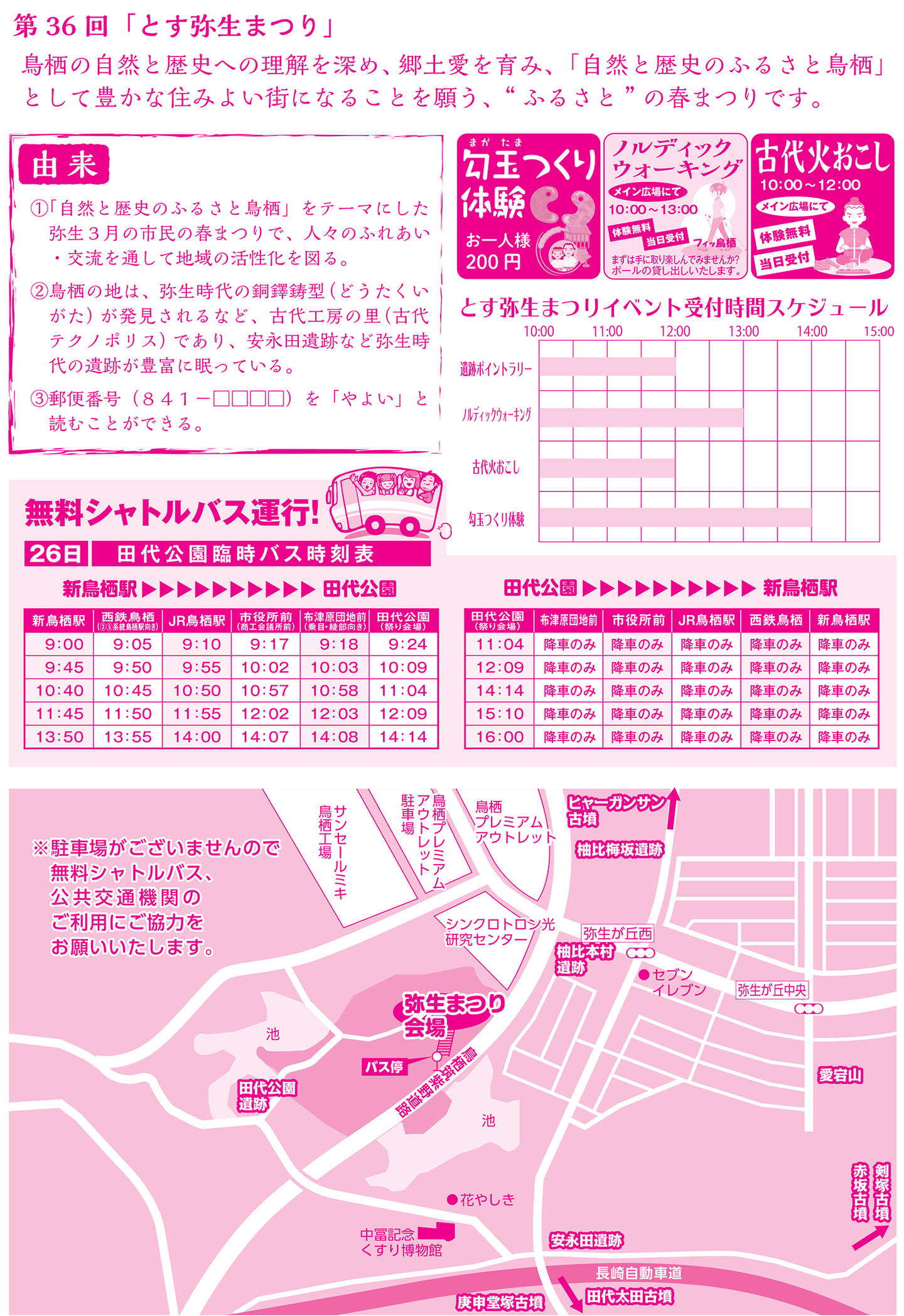 また、遺跡ポイントラリー、火起こしや勾玉(まがたま)作り体験、ノルディックウォーキング体験会、飲食物販やバザーも同時開催します。